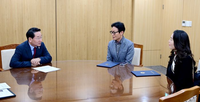 유정복(왼쪽) 인천시장이 13일 시청 접견실에서 임도완(가운데) 신임 인천시립극단 예술감독, 조현경 인천시립소년소녀합창단 예술감독과 대화를 나누고 있다.ⓒ인천시 제공