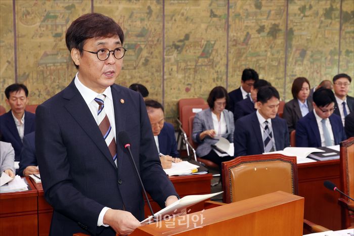 최휘영 문화체육관광부 장관이 14일 서울 여의도 국회에서 열린 국회 문화체육관광위원회 문화체육관광부에 대한 2025 국정감사에서 업무보고를 하고 있다.
