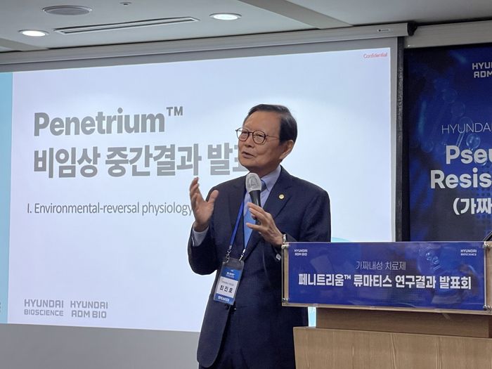 현대ADM바이오와 현대바이오사이언스는 14일 서울 중구 프레스센터에서 신약 후보물질 페니트리움의 류마티스 관절염 및 다발성 경화증에 대한 전임상(동물실험) 중간 결과를 공개했다.