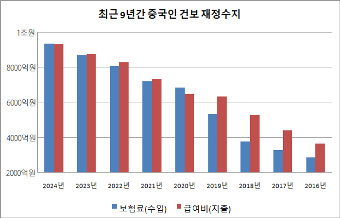 중국인의 국내 건강보험 수지가 흑자라는 항변이 최근 많이 나오고 있지만, 최근 9년간(2016~2024년) 중국인 건강보험 가입자의 재정수지를 내본 결과, 누적 4318억원 적자를 기록한 것으로 나타났다. 흑자로 반전된 것은 코로나19 팬데믹으로 인해 '한 해 반짝 흑자'를 기록했던 2020년을 제외하고는, 지난해 제도 개선을 단행한 이후부터였다.