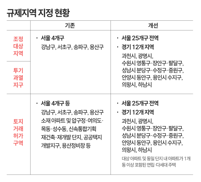 기존 강남구와 서초구, 송파구, 용산구에 대한 규제지역을 유지하면서 그 외 서울 21개 자치구 전체와 과천시, 광명시, 성남시 분당·수정·중원구, 수원시 영통·장안·팔달구, 안양시 동안구, 용인시 수지구, 의왕시, 하남시 등 경기도 12개 지역을 오는 16일부터 신규 규제지역으로 지정하기로 했다.