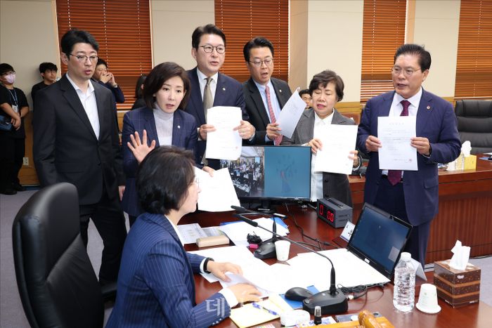 국민의힘 의원들이 15일 서울 서초구 대법원에서 열린 국회 법제사법위원회의 대법원에 대한 2025 국정감사에서 '2025도4697 사건에 대한 대법원 전원합의체 관련 서류제출 요구를 위한 의사일정 추가 서면동의서'에 대해 추미애 법사위원장에게 항의하고 있다.