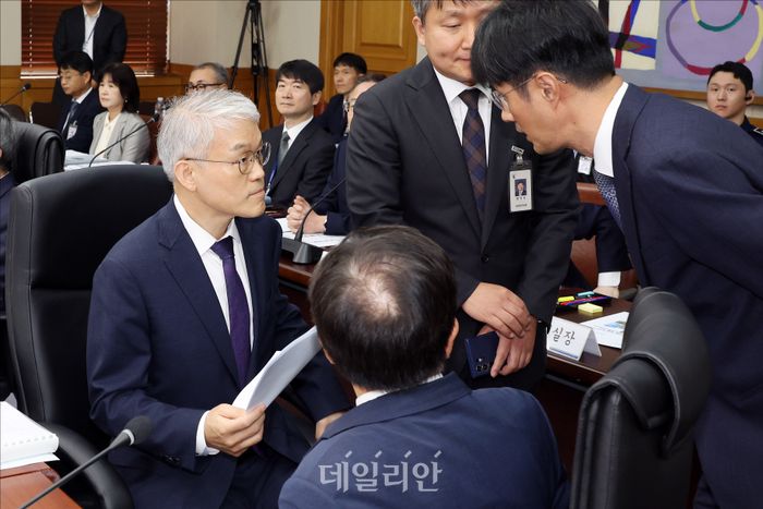 천대엽 법원행정처장이 15일 서울 서초구 대법원에서 열린 국회 법제사법위원회의 대법원에 대한 2025 국정감사에서 더불어민주당 등 여권 감사위원들이 현장검증을 위해 감사장을 떠난 뒤 대법원 관계자들과 대화를 하고 있다.