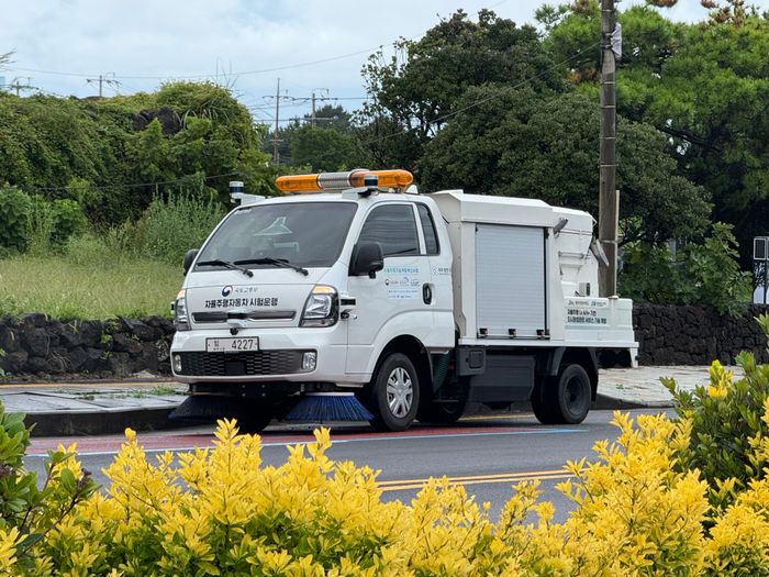 신제주권역(12㎞)과 첨단권역(4.8㎞)에서 각각 매일 1회씩 두 차례 실시된다. 청소차는 전기 트럭을 개조해 만든 자율주행 노면청소차 1대다. 자율주행 센서(라이다·카메라·레이더)와 실시간 통신모듈, 노면흡입 및 살수 분사 장치가 탑재됐다. 차량은 시속 10㎞ 이하로 주행하며 노면의 먼지·낙엽·쓰레기를 흡입·청소한다.