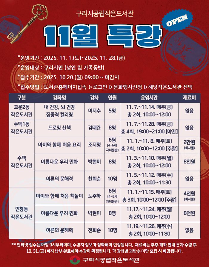 이번 특강은 공립 작은 도서관 4개소(교문2동, 수택1동, 수택, 인창동) 에서 11월 1일부터 28일까지 구리 시민을 대상으로 운영되며, 생활권 가까이에 있는 도서관을 통해 시민들이 소소한 행복과 휴식을 누릴 수 있도록 기획됐다.