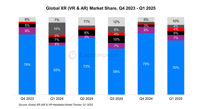 현재까지 가장 장악력이 큰 곳은 메타다. 카운터포인트리서치에 따르면 올해 1분기 기준 점유율은 70%로 소니, 중국의 피코(Pico), 엑스리얼(Xreal), DPVR 등 경쟁사들을 큰 차이로 따돌리고 있다.