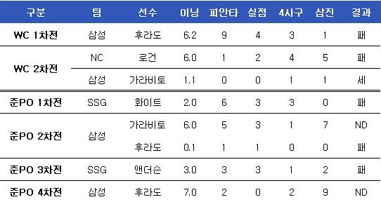 삼성 외국인 투수들도 아직 승리와 인연을 맺지 못하고 있다. 후라도는 와일드카드 결정 1차전에 선발로 나와 6.2이닝 9피안타 4실점한 뒤 패전 투수가 됐고, 준플레이오프 2차전에서도 끝내기 홈런을 맞아 다시 패했다. 이후 후라도는 PO행을 결정한 준PO 4차전서 7이닝 2피안타 무실점의 환상적인 투구 내용을 선보이며 승리 투수 요건을 갖췄으나 불펜 방화로 아쉽게 승리를 날렸다.