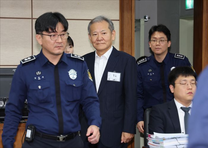구속 상태로 재판에 넘겨져 현재 서울구치소에 수감 중인 이 전 장관은 말끔한 남색 양복 차림으로 법정에 모습을 드러냈다. 왼쪽 가슴엔 수용번호 '52'가 적힌 명찰을 달았다.
