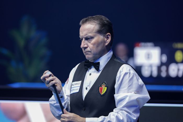 에디 멕스(벨기에)가 16일 오후 벨기에 앤트워프에서 열린 ‘제77회 세계3쿠션선수권대회’ 32강전서 심각한 표정으로 초크칠을 하고 있다.