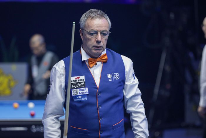 네덜란드의 딕 야스퍼스가 16일 오후 벨기에 앤트워프에서 열린 ‘제77회 세계3쿠션선수권대회’ 32강전서 신중하게 공을 보고 있다.