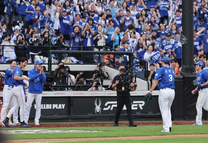 19일 대전 한화생명볼파크에서 열린 2025 KBO 포스트시즌 플레이오프 2차전 선발로 나선 삼성 최원태가 7회말 2사 이후 한화 권광민을 삼진아웃으로 처리한 뒤 더그아웃으로 들어오며 동료선수들에게 박수를 받고 있다. ⓒ 뉴시스