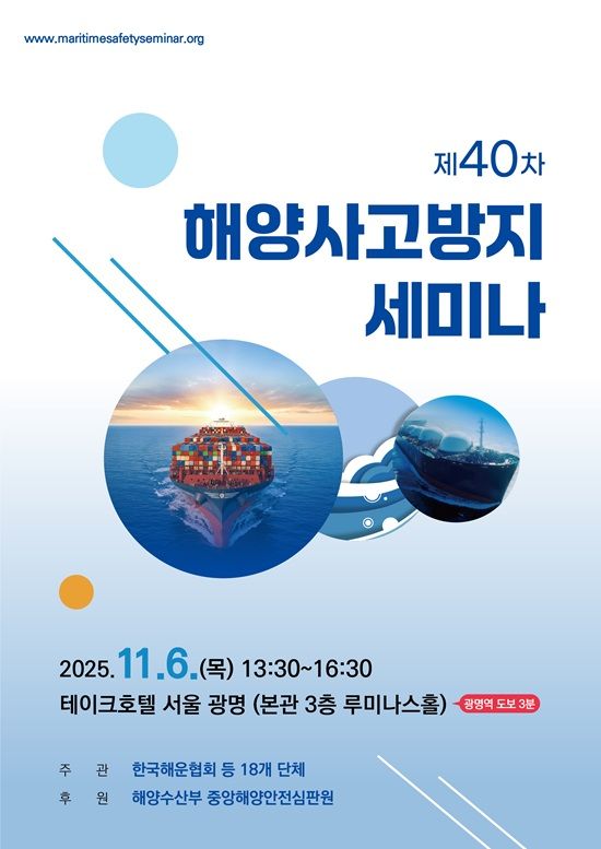 해양수산부는 내달 6일 경기도 광명시 테이크호텔에서 한국해운협회 등 18개 해양수산 단체와 함께 ‘제40차 해양사고방지 세미나’를 개최한다고 밝혔다.