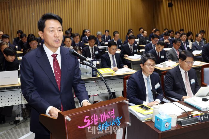 오세훈 서울시장이 20일 서울 중구 서울시청에서 열린 국회 국토교통위원회의 서울시청에 대한 2025 국정감사에서 업무보고를 하고 있다.