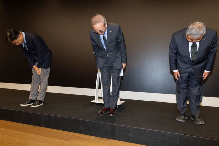 KT 주요 경영진들이 사과를 하고 있는 모습.왼쪽부터 네트워크부문장서창석 부사장, 김영섭 대표,Customer부문장이현석 부사장ⓒKT