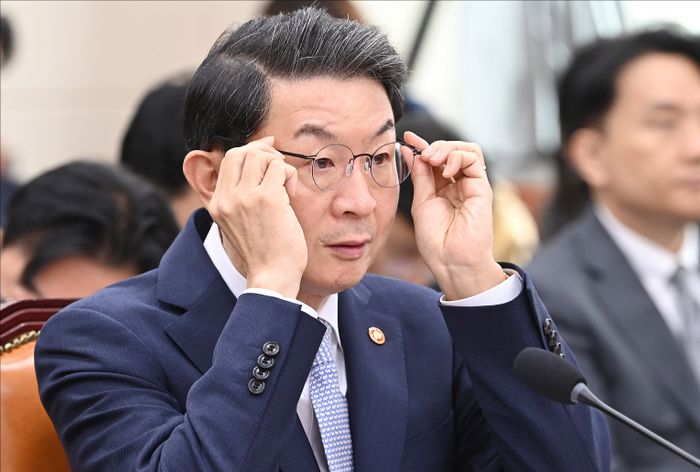 이억원 금융위원장이 20일 서울 여의도 국회에서 열린 국회 정무위원회의 금융위원회 등에 대한 2025 국정감사에서 안경을 고쳐쓰고 있다. ⓒ데일리안 홍금표 기자