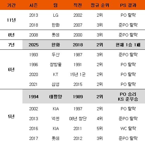 지금의 계단식 포스트시즌 제도가 도입된 1989년 이후, 5년 이상 장기 침체를 겪은 뒤 가을야구에 나선 사례는 총 12회. 이 가운데 무려 11개팀이 경험 부족을 이겨내지 못해 첫 단계서 탈락했다.