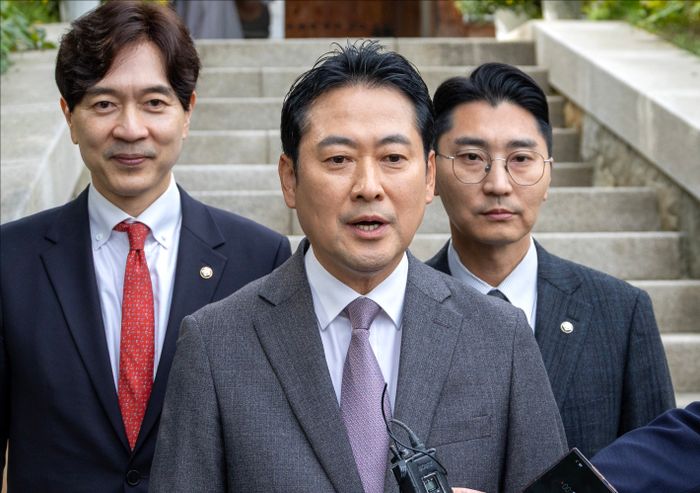 장동혁 국민의힘 대표(가운데)가 21일 오후 서울 강남구 봉은사를 찾아 대한불교조계종 총무원장 진우스님을 예방해 환담을 마친 후 기자들과 만나 부동산 정책 정상화 특위 위원장을 맡게 된 배경에 대해 설명하고 있다. 왼쪽은 박성훈 수석대변인, 오른쪽은 박준태 비서실장 ⓒ국회사진기자단