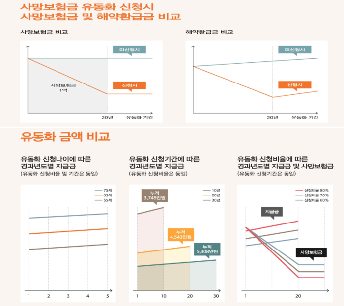 신청자는 보험사 비교안내 시스템을 통해 유동화 비율과 기간별 지급액을 미리 확인할 수 있으며, 필요 시 유동화를 중단하거나 조기 종료·재신청도 가능하다.