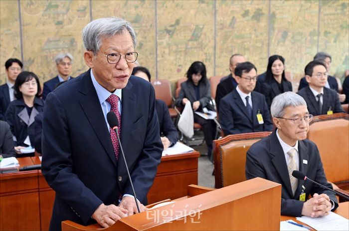 유홍준 국립중앙박물관장이 22일 서울 여의도 국회에서 열린 국회 문화체육관광위원회의 국립중앙박물관·한국문화예술위원회·국립중앙도서관 등에 대한 2025 국정감사에서 업무보고를 하고 있다.