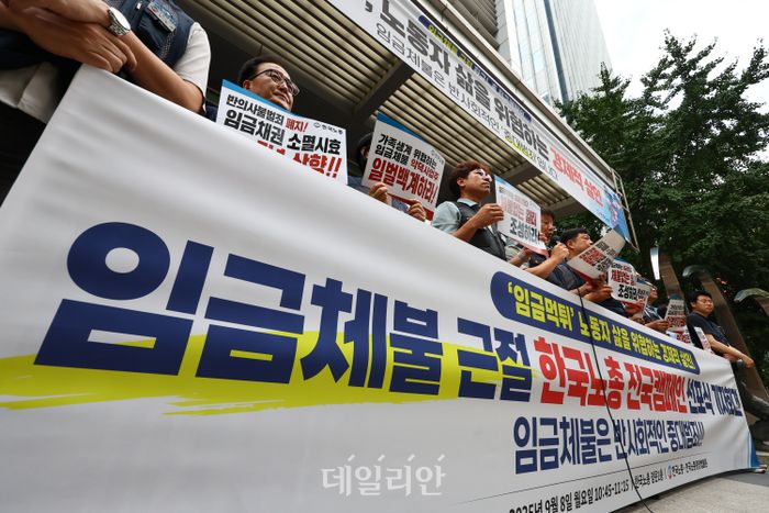 한국노동조합총연맹 조합원들이 지난달 8일 오전 서울 여의도 한국노총 앞에서 임금체불 근절 한국노총 전국캠페인 선포식 기자회견을 하고 있다. ⓒ뉴시스