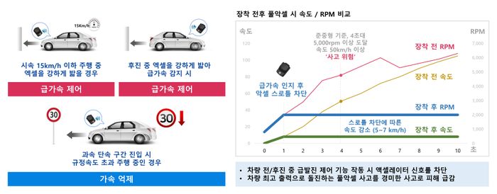 ‘페달 오조작 방지장치’는 운행 중 차량의 가속 신호를 실시간으로 분석하여 비정상적인 가속으로 판단될 경우, 운전자가 가속 페달을 밟더라도 해당 신호를 차단해 차량의 급발진을 방지하는 지능형 안전기술 장비다.