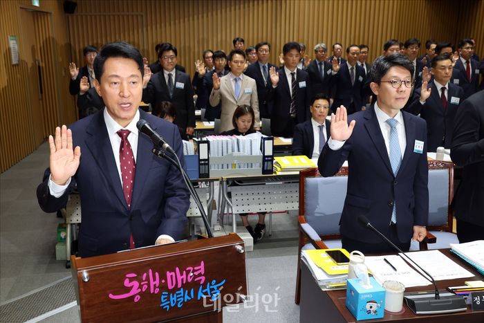 오세훈 서울시장이 20일 서울 중구 서울시청에서 열린 국회 국토교통위원회의 서울시청에 대한 2025 국정감사에서 증인선서를 하고 있다.