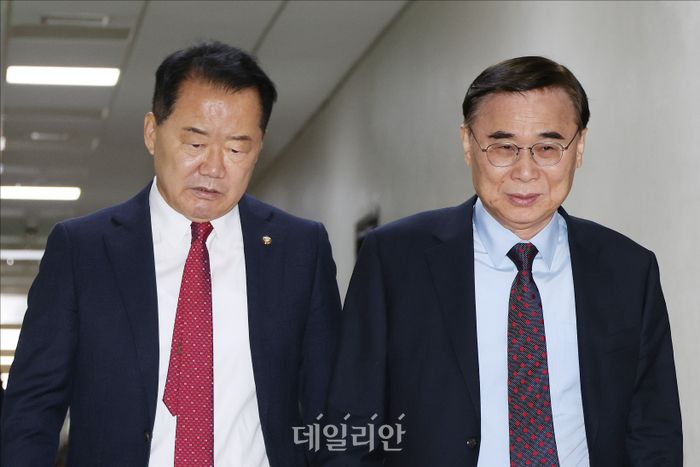 신성범 국회 정보위원회 위원장과 이종석 국가정보원장이 22일 오전 서울 여의도 국회에서 열린 국회 정보위원회 전체회의 시작 전 정보위원장실로 향하고 있다.