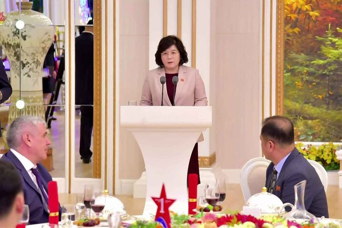 최선희 북한 외무상이 지난 6월 북한 러시아 평양수뇌상봉과 포괄적 전략적 동반자관계에 관한 조약체결 1주년에 즈음해 외무성과 북한주재 러시아대사관이 공동으로 개최한 연회에서 발언하고 있다.ⓒ뉴시스