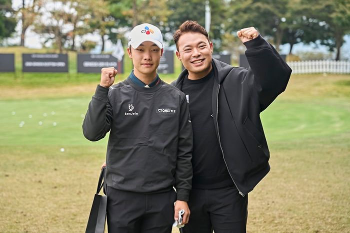 대회장을 찾은 이승택이 송민혁의 선전을 기원하며 기념촬영을 하고 있다. ⓒ KPGA