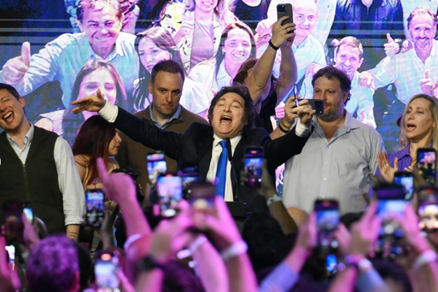 26일(현지시간) 하비에르 밀레이 아르헨티나 대통령이 부에노스아이레스의 여당 선거 캠프에서 지지자들과 환호하고 있다. ⓒAFP/연합뉴스