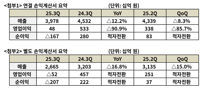 3분기에는 ‘고객 감사 패키지’ 시행 등의 영향으로, 매출은 전년 동기 12.2% 감소했으며 영업이익은 90.9% 감소했다. 별도 기준 매출은 2조6647억원, 영업손실 522억원, 당기순손실 2066억원으로 집계됐다.