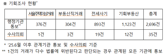 국토부는 서울 주택 이상거래, 전세사기 및 기획부동산 등 불법행위 전반을 조사해 지난 6월 이후 총 2696건에 달하는 의심거래를 국세청과 금융위 등에 통보했고 그 중 35건은 경찰청에 수사 의뢰했다.