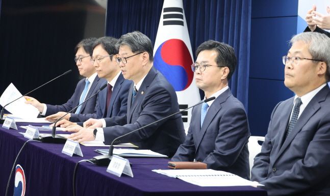 김용수 국무조정실 국무2차장(가운데)이 30일 오전 서울 종로구 정부서울청사에서 부동산 불법행위 대응 관계 부처 합동브리핑을 하고 있다. 왼쪽부터 오상훈 국세청 자산과세국장, 김규철 국토교통부 주택토지실장, 김 국무2차장, 신진창 금융위원회 사무처장, 홍석기 경찰청 수사국장.ⓒ뉴시스
