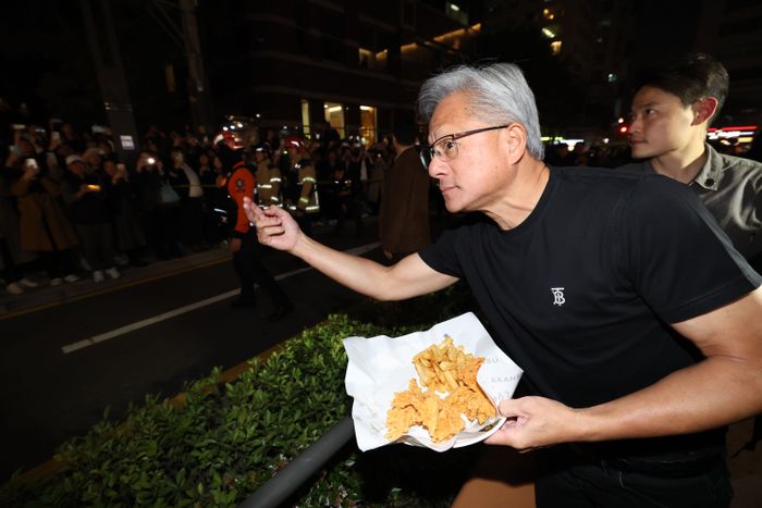 젠슨 황 엔비디아 최고경영자가 30일 서울 삼성동 한 치킨집에서 진행된 이재용 삼성전자 회장, 정의선 현대차그룹 회장과 치맥 회동 중 시민에게 치킨과 감자튀김을 나눠주고 있다. ⓒ연합뉴스