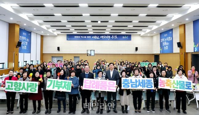 정해웅 충남세종농협본부장이 올해 초 세종 농협대회의실에서 농가주부모임 회원들과 고향사랑기부제의 성공적 정착을 위한 홍보 캠페인을 진행하고 있다. ⓒ충남세종농협