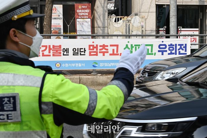경찰이 경기도 수원시 세류동 한 사거리에서 우회전 시 일시정지 의무 위반 차량 단속을 하고 있다.ⓒ뉴시스