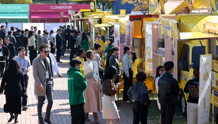 지난달 29일 APEC CEO 써밋이 열린 경북 경주예술의전당 앞에 국내외 참가자들이 K-푸드 체험존에서 음식을 시식하기 위해 기다리고 있다.ⓒ뉴시스