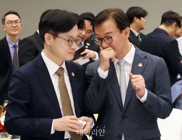 김정관 산업통상부 장관과 전재수 해양수산부 장관이 2일 서울 용산 대통령실 청사에서 열린 한-싱가포르 공식오찬에서 대화를 나누고 있다.ⓒ뉴시스