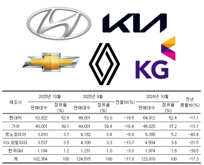 3일 업계에 따르면 국내 완성차5사(현대자동차·기아·르노코리아·한국GM·KG모빌리티)는 10월 한 달 동안 국내 시장에서 총 10만2364대를 판매했다. 지난해 같은 기간 대비 무려 17.8% 감소한 수치다.