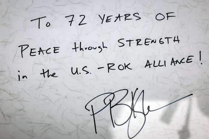 한편 헤그세스 장관은 방명록에 '한미동맹의 힘으로 이룬 72년의 평화'(To 72 YEARS OF PEACE through STRENGTH in the U.S-ROK ALLIANCE!)라고 적었다.