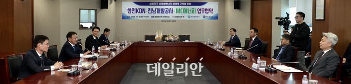 한전KDN은 3일 광주전남공동혁신도시 소재 본사 17층 대회의실에서 전남개발공사, MC에너지와 함께 '삼포지구 신재생에너지 생태계 구축사업 업무협약'을 체결했다.ⓒ한전KDN