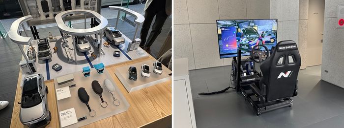 현대자동차 오사카 CXC(고객경험센터) 내 전시된 HMGICS(현대차그룹 싱가포르 혁신센터) 모형 및 차량 굿즈(왼쪽)와 아이오닉 5 N의 드라이빙 시뮬레이션 체험 공간(오른쪽) ⓒ데일리안 편은지 기자