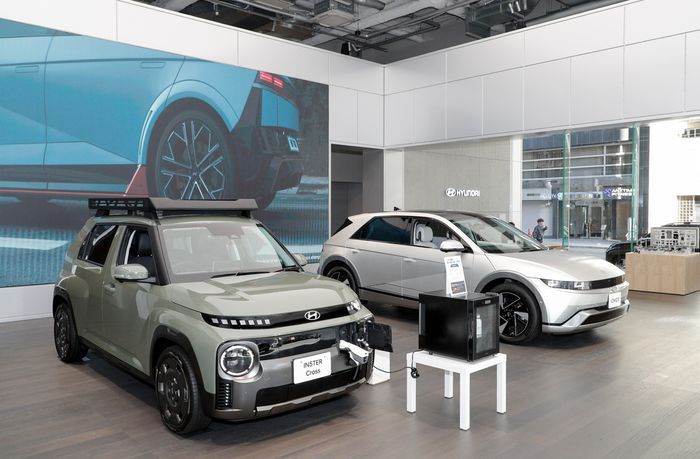 현대자동차 오사카 CXC(고객경험센터) 1층 공간. 인스터(캐스퍼 일렉트릭 현지명)와 아이오닉 5 모델이 전시돼있다. ⓒ한국자동차기자협회