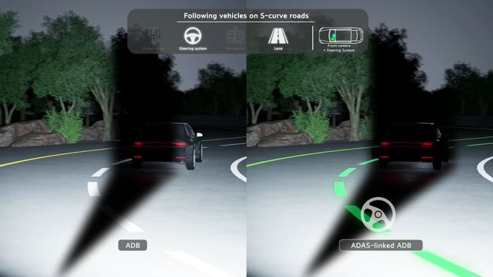 ADB(Adaptive Driving Beam)는 상향등을 기본 상태로 유지하면서 전방 카메라 센서가 다른 차량을 인식하면 해당 영역만 빛을 차단해 눈부심을 줄이는 지능형 헤드램프다. 현대모비스는 여기에 카메라 정보 외에도 차량 내 레이더, 내비게이션, 조향 센서 등을 복합 활용해 추월, 급커브 등 급격한 주행 상황에서도 대응이 가능한 예측형 제어 기술을 구현했다. 세계 최초의 첨단 ADB 예측제어 솔루션으로 평가된다.