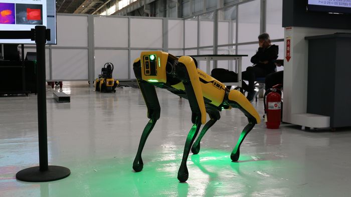 보스턴 다이나믹스의 4족 보행 로봇 'SPOT'이 공장을 자율 순찰하며 다양한 센서로 설비 상태를 실시간 모니터링하는 모습. ⓒ현대차·기아