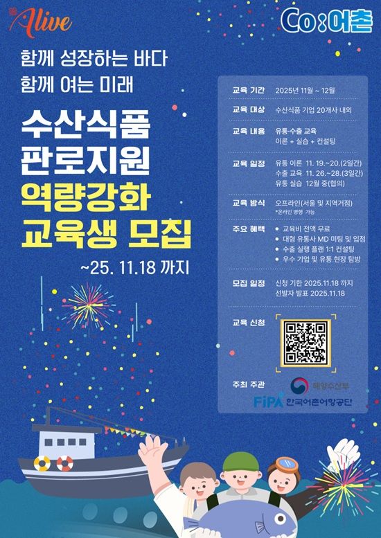 한국어촌어항공단(이사장 홍종욱, 이하 공단)은 오는 18일까지 수산식품 기업을 대상으로 국내 수산식품 기업의 유통·수출 역량 강화를 위한 ‘2025년 수산식품 판로지원 역량 강화 교육’ 참가자를 모집한다.