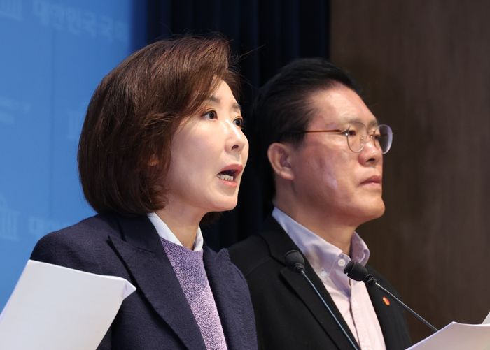 나경원 국회 법제사법위원회 국민의힘 의원을 비롯한 위원들이 9일 오전 서울 여의도 국회 소통관에서 정성호 법무부 장관과 이재명 대통령의 대장동 사건 피고인 항소 포기 개입 의혹을 제기하며, 법제사법위원회 긴급현안질의 개회 및 진상규명을 요구하는 기자회견을 하고 있다. ⓒ 뉴시스