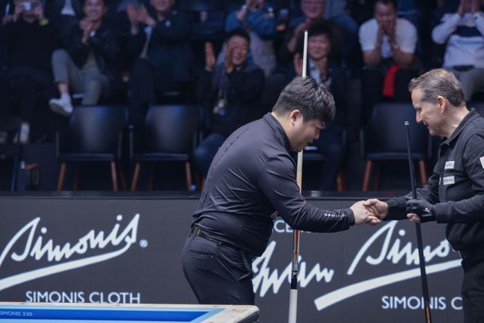 대한민국 조명우(서울시청)가 9일 광주 빛고을체육관에서 열린 ‘2025 광주 3쿠션 월드컵’ 준결승전서 승리를 거둔 뒤 에디 멕스(벨기에)와 인사를 나누고 있다.