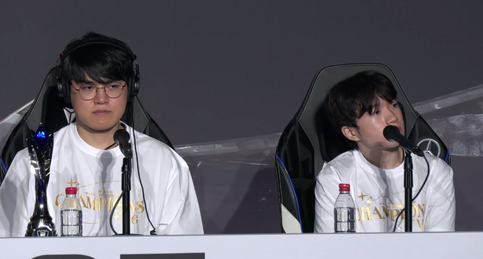 '구마유시' 이민형(왼쪽)과 '케리아' 류민석이 9일 중국 청두에서 열린 2025 리그 오브 레전드 월드 챔피언십(롤드컵) 결승전 경기 종료 후 기자회견에 참석해 취재진의 질문에 답변하고 있다. 온라인 기자회견 캡처.