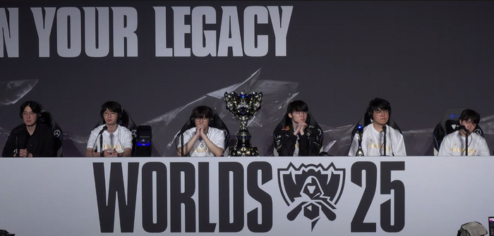 T1 선수단이 9일 중국 청두에서 열린 2025 리그 오브 레전드 월드 챔피언십(롤드컵) 결승전 경기 종료 후 기자회견에 참석했다. 온라인 기자회견 캡처